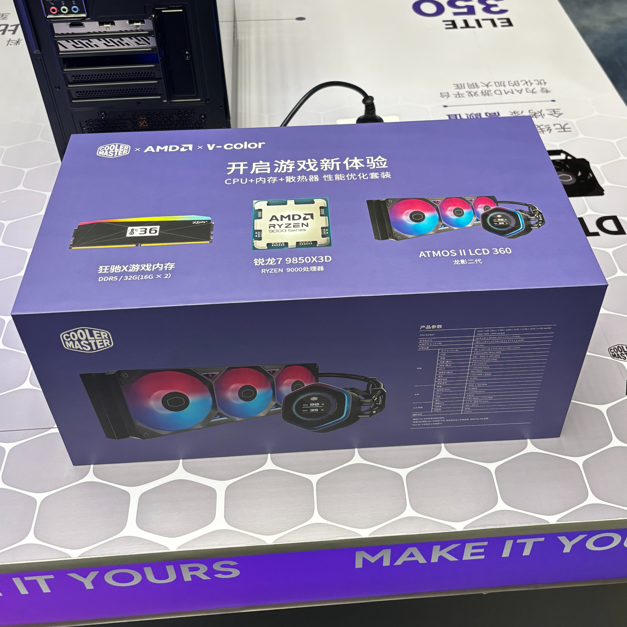 What adds extra heat to this story is that the event also showed signs of a second bundle configuration: a 32 GB 6000 MT/s kit paired with the Cooler Master ATMOS II LCD 360 all in one liquid cooler, alongside the new Ryzen 9850X3D. If both air and liquid bundles are being positioned under the same partnership umbrella, that suggests a broader go to market strategy rather than a one off collector box.