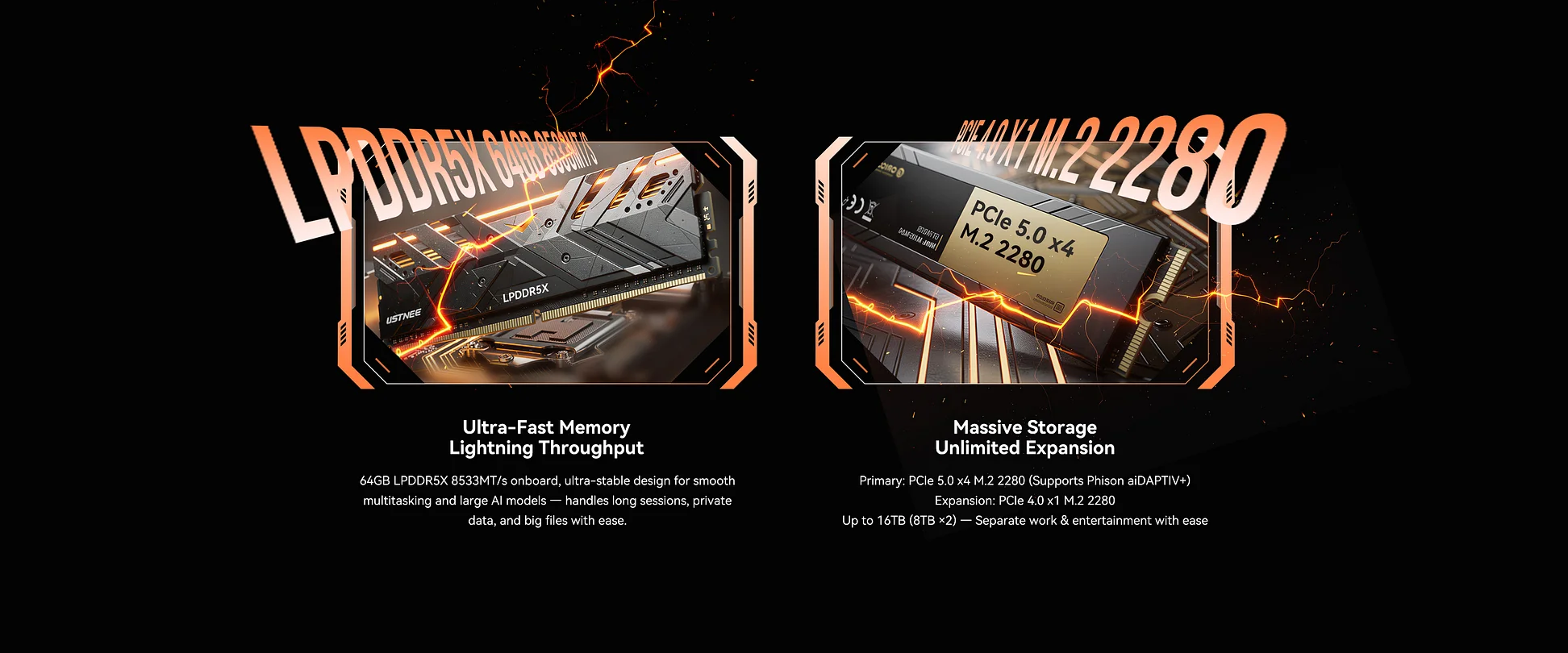 Memory and storage are equally ambitious for a mini PC in this class. The EVO T2 will ship with 64GB of LPDDR5X memory running at 8533 MT/s, giving it a very aggressive memory specification for a compact desktop system. Out of the box, buyers will receive 1TB of SSD storage, but GMKtec says total storage can be expanded up to 16TB through dual NVMe slots, including 1 PCIe 5.0 slot and 1 PCIe 4.0 slot. At launch, the only confirmed configuration is 64GB plus 1TB, so there is currently no official word on alternative RAM or SSD options.