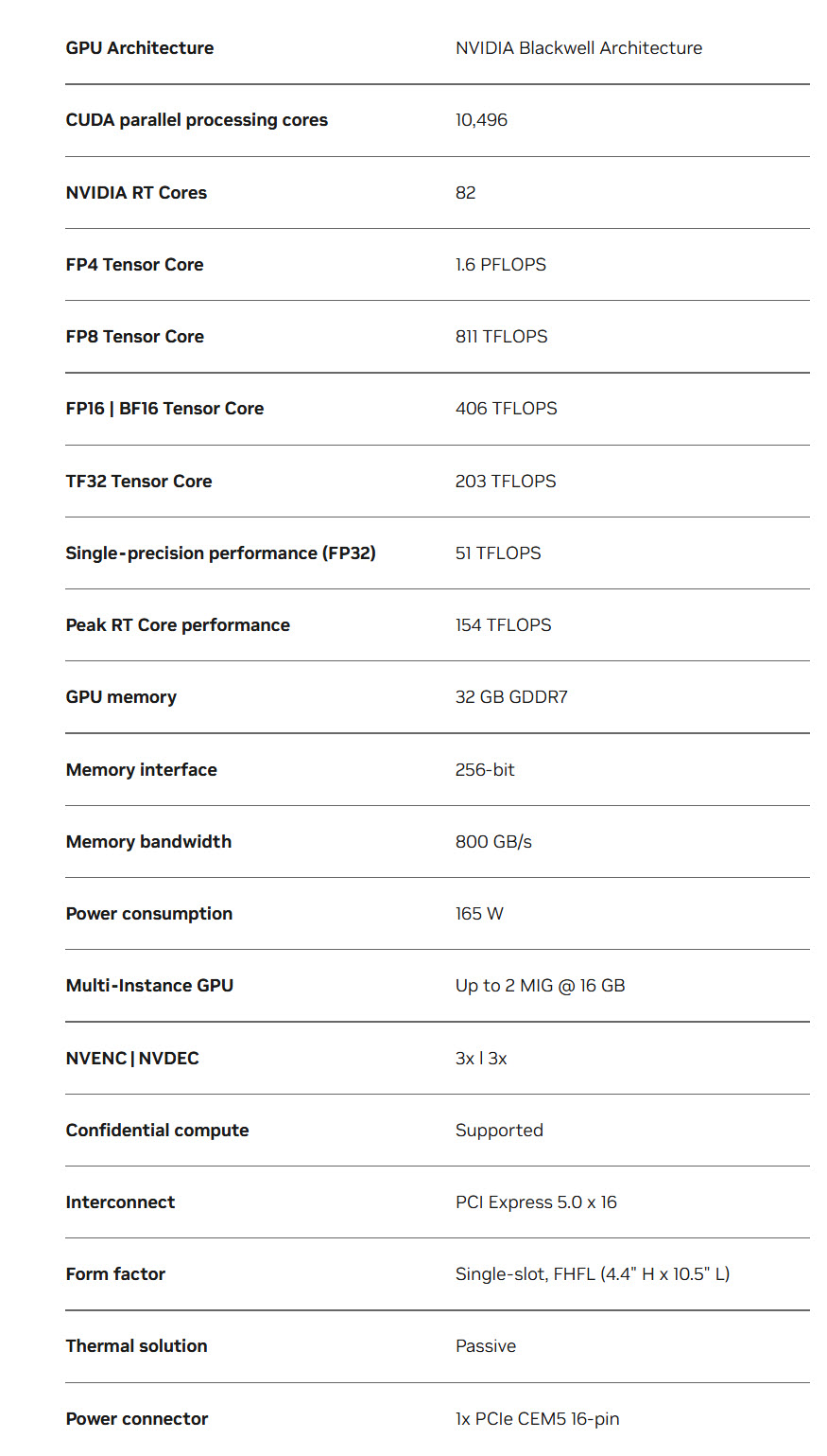 Memory is another major part of the pitch. NVIDIA equips the card with 32 GB of GDDR7 on a 256 bit interface, delivering 800 GB/s of memory bandwidth. For enterprise workloads, that amount of memory inside a compact server GPU can be especially useful for smaller language model inference, vision AI, vector databases, analytics, and mixed AI plus graphics deployments, all without stepping into much larger and more power hungry accelerator categories.